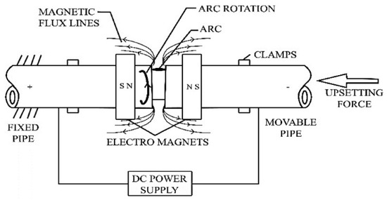 Magnetically Impelled Arc Butt (MIAB) welding is a solid-state welding process that uses heat, generated by the rotating arc, to plasticise the parts’ edges which are then fused and joined together by applying high pressure. This unique joining method uses permanent magnets (preferably made of AlNiCo) or electromagnets that generate the magnetic field between the workpieces to be welded (Figure 1). This process can be employed to weld tube to tube or tube to flange, and even to join irregular or non-circular workpieces [1]. The MIAB process is one of the fastest methods to weld tubes by which inclusion- and impurity-free welds are achieved. The joint is completely made in a single cycle, in contrast with other welding processes that require several passes to perform the welded joint. By applying MIAB welding, it is possible to make joints of pipes with an outer diameter from 75 mm up to 450 mm and a wall thickness up to 10–35 mm, in 10–15 s. The power consumption required for the MIAB welding of such tubes is lower in comparison to other solid-state processes [2,3,4,5,6,7,8]. Being an automated process, the results are achieved with a high degree of reliability if the study is replicated. In the MIAB process, the components are not rotated, so the alignment can be maintained without difficulty. This joining method can be employed for welding several alloy steel grades, such as T11, T91, mild steel or combinations of them, and it is also being explored for welding non-ferrous materials, such as Al to Al or Al to Cu [3,4,5,6,7].
