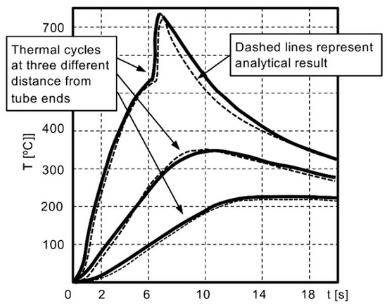 To obtain a quality weld, the temperature T and the distance y should be correlated. Thus, for a given temperature and distance, an optimum relationship between the heat input and arc rotation time can be established and, further, the width of the HAZ can be determined by applying it. Due to the different levels of current, measured at the start of the process, the heat input cannot be considered constant [9]. Based on heat flow theory, mathematical equations for predicting the temperature versus time have been developed and then the analytical results have been compared with the thermal cycles experimentally recorded at various distances from the tube ends, as shown in Figure 6 [26].