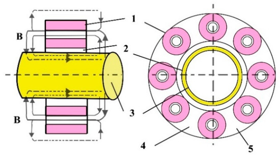 Principle sketch of the transverse magnetizing system: (a) superior half-disk (b) parts of the device and radial arrangement of coils. Reproduced from [30], Annals of “Dunarea de Jos” University of Galati, Fascicle XII, Welding Equipment and Technology, with permission of “Dunarea de Jos” University of Galati, 2000.