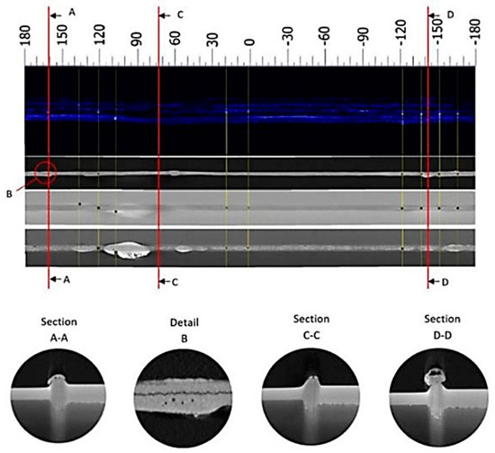 Using the Finite Element Method (FEM) to predict the temperature distribution along the tube’s periphery and thickness, Arungalai Vendan, S et al. [14] performed a nonlinear transient thermal analysis during the arc movement in the welding process. Considering the radial, circumferential and axial directions, the heat transfer is assumed as three-dimensional. In the weld reinforcement, the temperature reaches approximately 450 °C, and the weld line indicates a higher temperature gradient. The researchers reported that the arc’s high speed, nearly 250 m/s, can be modelled as multiple arcs at different locations. This model was used to analyse the zigzag and the circumferential arc movement along the joint surfaces. Based on this study, the temperature distribution with arc trailing from the outer diameter (OD) to the inner diameter (ID) should be correlated with the required speed. By changing the arc position from ID to OD, during the arcing phase, it was evident that the modification of temperature distribution versus time was determined by the modification of the magnetic field. These results were experimentally validated using IR temperature sensors that monitored the temperature change during the process. For a better accuracy in observing the temperature distribution, the authors extended the study to the four-arc system, also noticing a good weld penetration (Figure 7). Additionally, the magnetic arc blow phenomenon generated during the MIAB process was illustrated.
