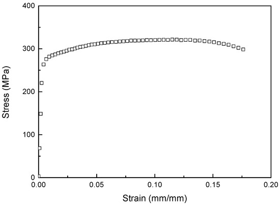 where σY is the dynamic yield stress, A is the initial yield stress, and B and n are the strain hardening parameters. is the equivalent plasticity strain, C is the strain rate sensitivity parameters, is the strain rate, T* is the equivalent temperature, m is the thermal softening index, and σH is the strain hardening term. However, the effect of temperature is not considered because of room temperature. The coefficients for the strain hardening terms (A, B, and n) are derived from quasi-static experiments, which depict material behavior following plastic stress. The quasi-static experiment measured the plastic behavior that is the reference for flow stress. This study used an MTS-810 at a strain rate of 0.01 s−1. The specimen was tested at a speed of 30 mm/min, as specified by the reference gauge length. The strain was measured with an extensometer (Model 3542). Therefore, the coefficients of strain hardening were obtained by fitting the data after the yield stress. The experimental process followed the guidelines of ISO 26203-2 [25]. The coefficients of the strain hardening term (A, B, and n) were obtained from the experimental results (Figure 2).
