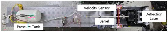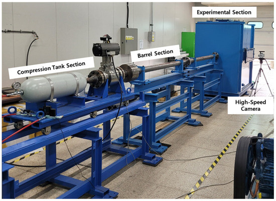 The equipment used in the ballistic impact experiment included compression tanks, barrels, and experimental sections, as depicted in Figure 11. The projectile was launched by applying a pressure of up to 100 bar. The experimental equipment featured a 4 m barrel with a diameter of 0.08 m. By using a 150 g projectile filled with helium gas at 70 bar pressure, we achieved a maximum velocity of approximately 380 m/s. Velocity was measured using a high-velocity camera (Phantom VEO E310L-18G-C). The impact images were recorded at 20,000 frames per second. The experimental environment was created with a vacuum of −0.96 bar to prevent resistance and shock. The injection velocity of the projectile under gas pressure can be predicted using Equation (18) [15].