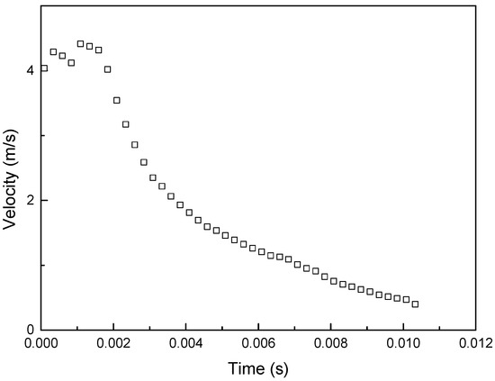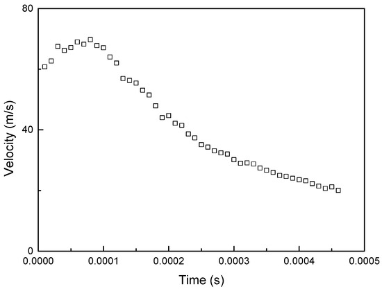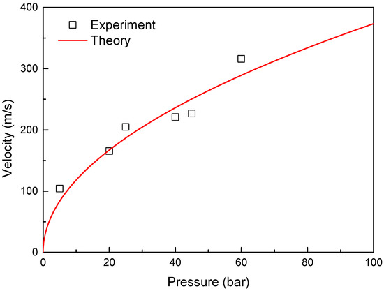 where R is the gas constant, Cv is the specific heat at constant volume, n is the polytropic index, V1 is the volume of the pressure tank, V2 is the volume after injection, P1 is the pressure of the tank, and v2 is the injection velocity. Figure 12 shows a comparison of theoretical and experimental velocities. By using this theory, the gas pressure for the experimental velocity was determined.