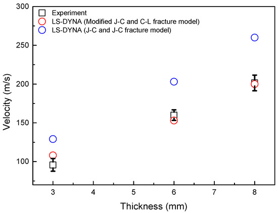 The coefficient verification of the MJC material and CL fracture model was performed by comparing the results of the experiment and the analysis on the aluminum 6061-T6 plate. The plate measured 300 mm × 300 mm. The thicknesses of the plates were 3 mm, 6 mm, and 8 mm. The projectile was a steel ball (diameter: 25 mm) of 64 g. The ballistic impact analysis results revealed the critical velocity at which penetration occurred, which was compared with the results of the experiments (penetration/nonpenetration velocity) to verify the coefficient, as illustrated in Table 4 and Figure 8. The Cl fracture model simulated excessive damage. It seems that the Cl fracture model is caused by not implementing the spalling fracture mode. Figure 9 illustrates a comparative analysis between the JC material and JC fracture models and the MJC material and CL fracture models alongside experimental results. The critical velocity at which the predicted penetration occurs by applying the coefficients of the MJC material and CL fracture model corresponds to the nonpenetration/penetration velocity range of the ballistic impact experiment.