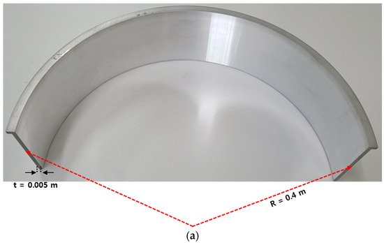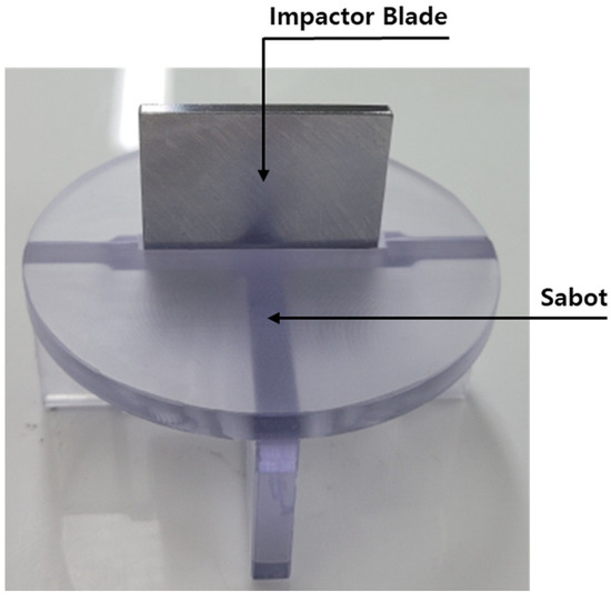 The ballistic impact experiment involved a 0.4 m diameter specimen made of aluminum 6061-T6. The projectile used was a steel blade with a mass of 0.055 kg measuring 0.05 m by 0.04 m. Helium was employed as the pressurizing gas. To prevent projectile shock, the experiments were conducted in a vacuum environment at −0.95 bar. Additionally, a sabot (as shown in Figure 13) was designed to maintain the projectile’s trajectory. The impact angle of the projectile was carefully controlled (as depicted in Figure 14). The experimental results were used to assess the damage profile and the corresponding projectile velocity post-impact. We measured the projectile’s velocity in both nonpenetration and penetration scenarios on a cylindrical shell with a 5 mm thickness, and the damage pattern was confirmed after the experiment.
