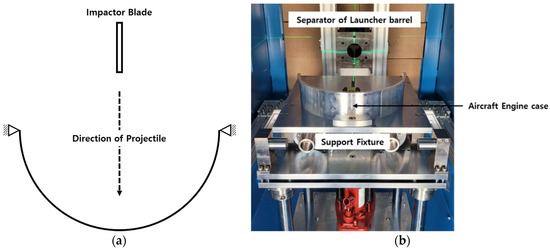 The experimental methods for containment evaluation consist of high-velocity rotation and ballistic impact experiments. A high-velocity rotation experiment simulates the actual rotation of an aircraft engine blade. The blade has a notch that breaks at a specific speed and causes damage when the rotor is spun. Le [3] evaluated the containment of an aircraft engine using a high-velocity rotation experimental device. He et al. [4] evaluated the containment using a high-velocity rotation experiment of a soft-wall aircraft engine made of composite and metallic materials. Although this study could accurately identify the damage to the blade fragment and the inside of the engine case, it was difficult to predict the speed at which blade damage occurred [5,6].