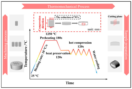 The experimental procedure and the hot compression test carried out on a Gleeble-3800 thermal simulation testing machine are presented following the schematic map in Figure 2. The experimental specimens with a diameter of 10 mm and a height of 15 mm were cut from the 26CrMo7S steel [17,18]. As depicted in the machining process/left side of Figure 2. To ensure uniform deformation during the hot compression test and minimize friction between the specimen and the indenter, high temperature lubricant in the form of mica flakes was applied on both ends of the specimen. The curve within Figure 2 show the thermomechanical process. Initially, the specimens were preheated to 1250 °C at a rate of 10 °C/s and held at this temperature for 180 s to complete austenitization. Subsequently, they were cooled to the deformation temperature at the same rate and held for 120 s, following which isothermal compression began. After hot compression, the specimens were cooled in water to room temperature. In order to analyze the microstructure, all specimens were cut along the axial cutting plane (as depicted in the sample preparation section of Figure 2) and then mounted, ground, and polished.