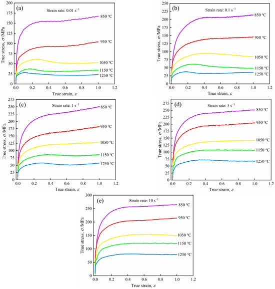 When the strain was 1 s−1, at a deformation temperature of 850~1050 °C, the flow stress curve increased with increasing strain, displaying dynamic recovery [24,26], while the flow stress curve with a deformation temperature of 1150 and 1250 °C demonstrated dynamic recrystallization. When the strain rate was 5 and 10 s−1, the flow stress curve exhibited a dynamic recovery type at deformation temperatures ranging from 850 °C to 1250 °C. As the strain increased, the flow stress peaked and demonstrated a tendency towards flattening or continuous rise.