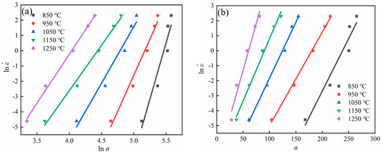 According to the Prasad criterion, the material’s flow stress and strain rate have an exponential function for specific strain and deformation temperature, which can be expressed with Equation (19).