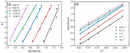 The substitution of the flow stress value under peak conditions into Equation (11) enabled the linear fitting of the scatters of , as shown in Figure 4d. The resulting graph indicated that the average slope of the linear fitting curve was 8.39921, with an intercept average of −5.61362. As a result, the average value of hot deformation activation energy was calculated, being Q = 452,648 kJ/mol, and ln A is calculated to be 38.98675.