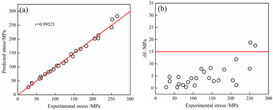 Calculation of the error between the predicted value of the peak stress and the experimental value: (a) ; (b) AE.