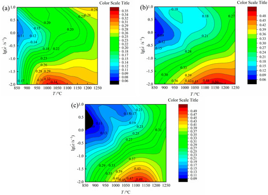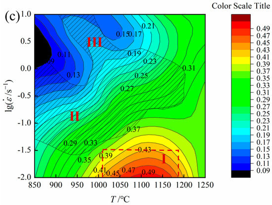 Hot processing maps of 26CrMo7S steel with strains of (a) 0.1; (b) 0.4; (c) 0.7.
