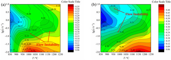 With increasing strain, the region where plastic instability occurred expanded. For example, a strain of 0.4 resulted in plastic instability in regions where the deformation temperature ranged from 850 to 1223 °C and the strain rate from 10−1.66 to 100.221 s−1. Similarly, the high strain zone with a temperature range of 900~1005 °C and a strain rate between 100.466 and 10 s−1 also showed characters of local instability (Figure 9b). These areas suggested that high strain rates could easily lead to localized instability in the material.