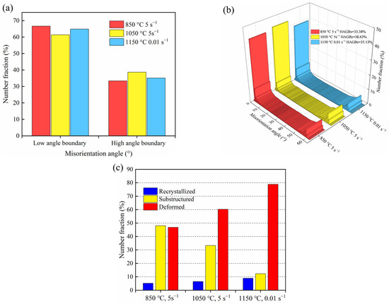 Figure 11 displays the EBSD results of the experimental steel under different thermal conditions. It includes statistics of high- and low-angle grain boundaries (a), grain boundary distribution (b), and recrystallized fraction (c). As shown in Figure 11a,b, the proportion of LAGB is prominent in the grain distribution, while the percentage of HAGB increases with the temperature rise. Specifically, the percentage of HAGB is 33.38%, 38.63%, and 35.13%, respectively, for different thermal conditions. Figure 11c calculates the statistics of the three structures in the recrystallized distribution maps. The proportion of recrystallized structure increases with the temperature increase. The primary microstructure after deformation at 850 °C, 1050 °C, and 1150 °C constituted the substructure with a number fraction of 48%, 33%, and 12%, respectively. The substructure may be related to dislocation cells formed by dislocation stacking [48].
