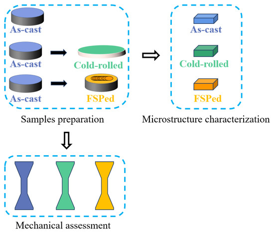 Dog-bone-shaped tensile specimens with a gauge length of 8 mm and cross-section area of 3.4 mm × 2 mm were prepared. Tensile testing was conducted under room temperature conditions using a universal testing machine (UTM 5105, SUNS, Shenzhen, Guangdong, China), following the standard of GB/T 228.1-2021 [25] with a strain rate of 1.0 × 10−3 s−1. Measurements were performed at least three times to ensure the accuracy of the tensile tests. Vickers hardness tests were conducted using a microhardness tester (200HV-5, HUAYIN, Laizhou, Shandong, China), applying a load of 1 kG for a duration of 10 s. The cold-rolled samples used for observation and mechanical property testing were cut along the rolling direction. FSPed samples used for observation and mechanical property testing were all cut perpendicular to the processing forward direction, and contain only the weld nugget zone. A graphical illustration of the experimental flow is displayed in Figure 1.