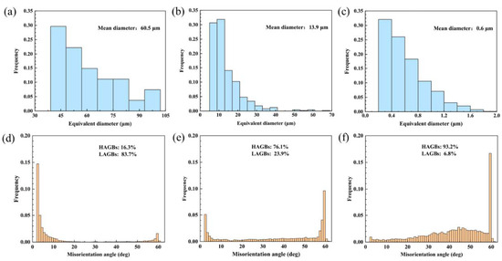 EBSD images of grain size distribution (in blue) and grain boundary misorientation distributions (in yellow) of (a,d) as-cast sample, (b,e) cold-rolled sample, and (c,f) FSPed sample.