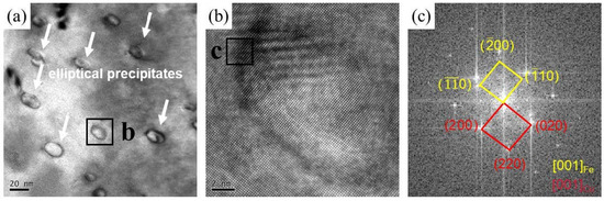 Further high-resolution characterization such as TEM is necessary due to the limited information provided by SEM and EBSD. Figure 7 includes bright-field TEM images and corresponding selected area electron diffraction (SAED) of both as-cast samples and FSPed samples. Figure 7a illustrates the morphology, showing independently distributed square particles within the matrix in the as-cast sample. According to the SEAD results illustrated in Figure 7d,e, it is verified that the matrix is composed of Cu, whereas the square particles contain Fe phases. Conversely, the particles in the FSPed specimen exhibit dispersed distribution features and are considerably smaller in size. Figure 8 presents the high-resolution TEM (HRTEM) images of the Cu-10 wt% Fe alloy processed using FSP along with its corresponding fast Fourier transform (FFT) patterns. Based on the SAED image in Figure 8c, it can be concluded that these fine-precipitate phases diffusely distributed in the Cu matrix with an average size of about 20 nm are also Fe phases.