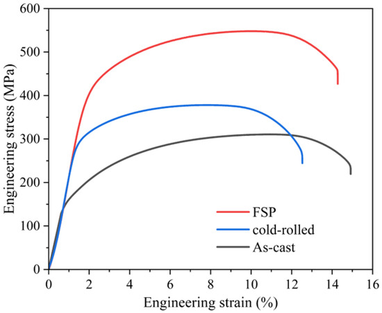 - Furthermore, the FSPed specimens showed excellent mechanical properties, including high hardness (165.5 HV), high tensile strength (538.3 MPa), and good elongation (16.1%). The mechanical properties are considerably higher compared to other cast and cold-rolled states. The enhancement in mechanical properties of FSPed samples is mainly attributed to the significant grain refinement and retention of fine precipitates.