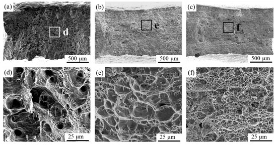 The stress–strain curves of three specimens are presented in Figure 9, and their mechanical properties are summarized in Table 1. In the case of the as-cast Cu-10 wt% Fe alloy, the ultimate tensile strength (UTS) and elongation at fracture (EF) were 303.7 MPa and 16.6%, respectively. The UTS of the cold-rolled specimens increased to 373.6 MPa compared to the cast Cu-10 wt% Fe alloy, whereas the EF decreased to 12.1%. The mechanical properties demonstrate a more significant increase in FSP as the degree of deformation increases. The UTS and EF increased to 538.3 MPa and 16.1%, respectively. The microhardness shows a consistent pattern of change with UTS. In its as-cast state, Cu-10 wt% Fe alloy has an average Vickers hardness of 87.5 HV. However, the Vickers hardness of Cu-10 wt% Fe alloy increases to 114.9 HV after being subjected to cold-rolling deformation. It is apparent that the microhardness of WNZ of FSPed samples is remarkably high, at 163.5 HV. Figure 10a–f provides the corresponding morphology of the fracture, which displays significant necking. In the high-magnification images, numerous typical microscopic toughness features are observable. These features indicate that the fracture was ductile in nature.