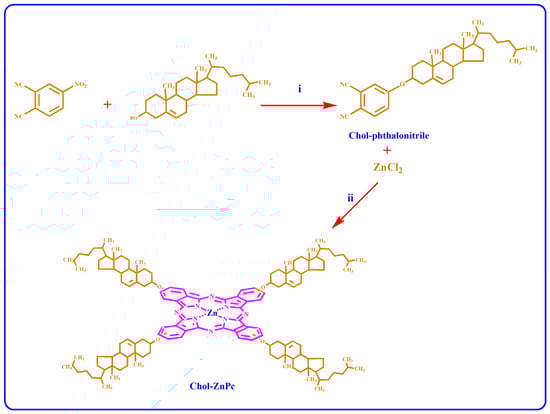 Synthesis of Chol-substituted phthalonitrile (i) and Chol-ZnPc (ii).