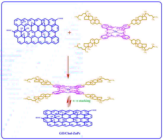 GO (2 µg/mL) was dispersed in DMSO at room temperature by using a Bandelin HD 2070 ultrasonic homogenizer (Berlin, Germany). At the same time, Chol-ZnPc was also prepared in DMSO (5 µg/mL), and then introduced to the GO-DMSO mixture. The resultant solution was further sonicated for 25 min at room temperature. Then, the GO/Chol-ZnPc composites were filtered, washed with DI water, and then dried in vacuum oven until a constant weight was reached. The weight percentage of GO (based on the feed composition) in the composite was ~29%. The process is schematized in Figure 2.