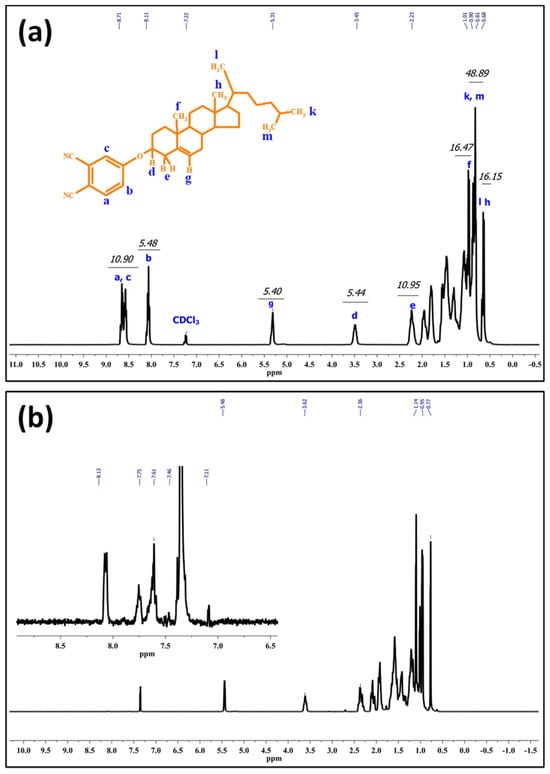 1H-NMR spectrum of Chol-phthalonitrile (a) and Chol-ZnPc (b).