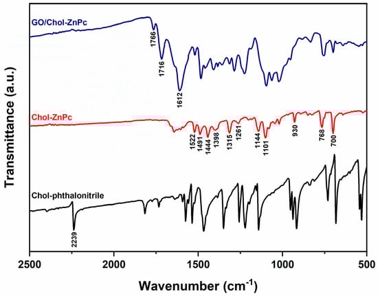 Incorporation of GO to Chol-ZnPc was verified by FT-IR analysis, as shown in Figure 4. The characteristic C≡N peak of the phthalonitrile was recorded at about 2239 cm−1 in the FT-IR spectrum of Chol-phthalonitrile (Figure 4). This peak was not detected in the FT-IR spectrum of Chol-ZnPc, further indicating the successful tetramerization reaction. Also, the IR peaks at about 1522 cm−1, 1491 cm−1, 1444 cm−1, 1398 cm−1, 1315 cm−1, 1261 cm−1, 1144 cm−1, 1101 cm−1, 930 cm−1, 768 cm−1, and 700 cm−1 could be ascribed to the characteristic skeletal vibrations of ZnPc macrocycles, and were observed in Chol-ZnPc as expected [55,56,57,58,59,60,61,62]. Particularly, the characteristic Pc macrocycle bands at about 1491 cm−1, 1101 cm−1, and 768 cm−1 were red-shifted in the GO/Chol-ZnPc, indicating interactions between GO and Chol-ZnPc. Regarding the peaks at about 1766 cm−1 and 1716 cm−1, they could be ascribed to the C=O stretching vibrations of carbonyl and carboxyl groups of GO [63,64,65,66]. Moreover, the peak at about 1612 cm−1 could be ascribed to the C=C stretching vibrations of graphitic domains in GO [63,64,65]. These three peaks were only observed in the FT-IR spectrum of GO/Chol-ZnPc, and their presence indicates that the GO/Chol-ZnPc composites were successfully prepared.