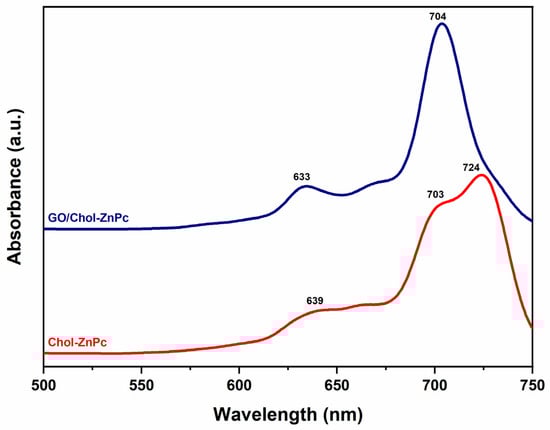 In addition, Chol-ZnPc and GO/Chol-ZnPc were studied using ultraviolet–visible (UV–Vis) spectroscopy in DMSO (Figure 6). Figure 6 shows that both the Chol-ZnPc and GO/Chol-ZnPc exhibited the typical Q bands of Pcs within the therapeutic window, in accordance with previous reports [67,68,69]. As is known, the characteristic Q band is due to the π−π* transition of the Pc ring from the highest occupied molecular orbital (HOMO) to the lowest unoccupied molecular orbital (LUMO) [70]. Interestingly, while GO/Chol-ZnPc showed monomeric Q bands, Chol-ZnPc exhibited a doublet with absorbance maxima at about 703 nm (Qx) and 724 nm (Qy), suggesting aggregation of Chol-ZnPc in the solvent [67]. Upon introduction of GO, the doublet disappeared and turned into a single peak, an observation in good agreement with previous reports [37]. Further, this peak was blue-shifted as compared to Qy. In fact, most previous studies reported a red shift in the Q band upon covalent attachment of GO to Pc [71,72,73]. However, the processing time was too limited in the present work for a covalent attachment. In addition, it could be realized that the functional groups in the present work cannot allow a hydrogen bonding, unlike the previous work of Yabas et al. [37]. In fact, both the red shift and the blue shift of the Q band were reported as depending on the substituted groups in previous works where various GO and Pc derivatives were coupled at relatively similar processing conditions [42,74,75], and the blue shift of the Qy in the present work might be ascribed to π−π and electrostatic interactions between GO and Chol-ZnPc.