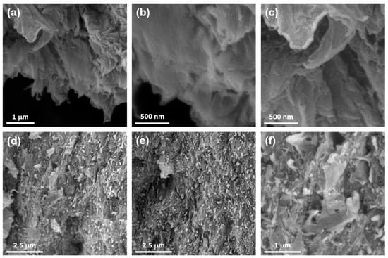 SEM images of GO (a–c) and GO/Chol-ZnPc (d–f).