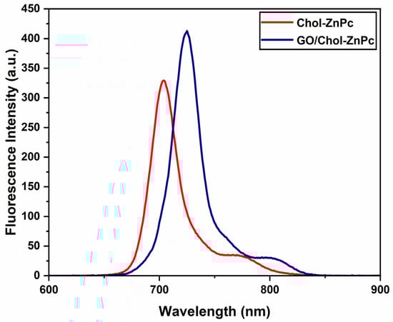 As is known, the efficiency of fluorescence emission is important in PDT applications, particularly for image guidance. In this sense, we studied the fluorescence spectra of Chol-ZnPc and GO/Chol-ZnPc in DMSO, as can be seen in Figure 7, and calculated the according to Equation (1) [76]: