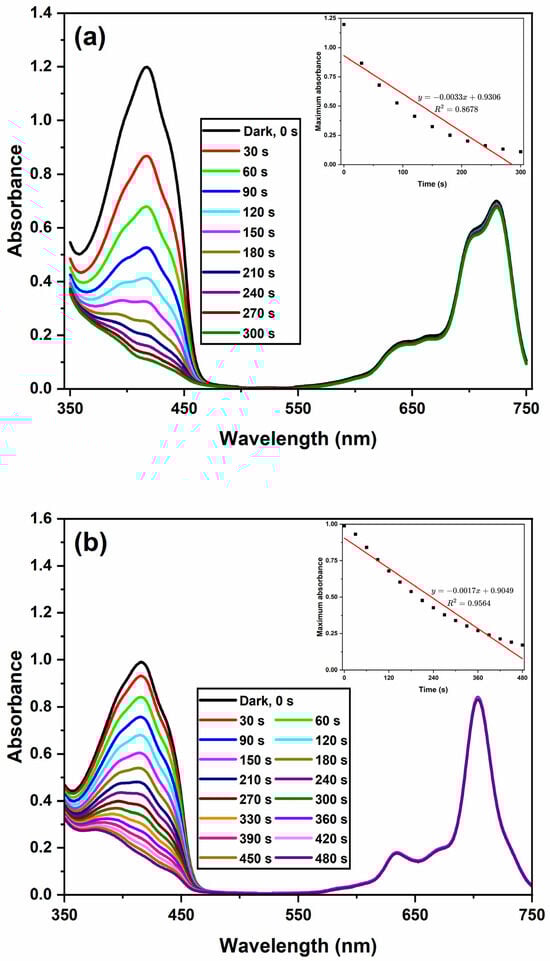 The singlet oxygen quantum yield () was determined in DMSO via a common method [77,78,79,80,81,82] by using 3-diphenylisobenzofuran (DPBF) as a singlet oxygen scavenger and unsubstituted ZnPc as a standard. As is known, DPBF does not decompose with singlet oxygen; instead, its reaction with singlet oxygen causes a decrease in the absorbance intensity at 417 nm, which could be used to measure the singlet oxygen generation ability [78]. Thus, DMSO solutions containing Chol-ZnPc and GO/Chol-ZnPc were prepared separately with DPBF in the dark, and irradiated for certain times. Then, the singlet oxygen generation-dependent degradation in the absorbance of DPBF was monitored for both Chol-ZnPc and GO/Chol-ZnPc at each time interval, as shown in Figure 9, and the singlet oxygen quantum yields were calculated by Equation (2) [77]: