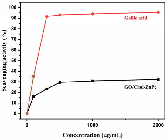 On the other hand, it is worth mentioning that the actual PDT performance of a photosensitizer on a living cell is a much more complex case, and it necessitates information on pharmacodynamics and pharmacokinetics to draw more precise conclusions. Particularly, although some previous reports indicated positive effects of using GO in terms of improving PDT properties [41,42,43,44,45,46,47,48,99], there exists diverse information regarding the cytotoxicity of GO depending on the synthesis conditions, functional groups, aggregation, contamination, cell type, and so forth [100,101,102,103,104,105,106,107]. While we did not provide the cytotoxicity assay of the GO/Chol-ZnPc in the present work, the antioxidant activity of the composite was evaluated using the Blois method, as shown in Figure 10. This method is based on the reduction of DPPH, a stable free radical, by the antioxidant and its color change. As is known, DPPH provides the maximum absorption at 517 nm (violet color) [108,109]. When the single electron in the DPPH free radical pairs with hydrogen from the antioxidant, the intensity of the strong absorbance band at 517 nm decreases, and the color of DPPH changes from violet to yellow. We determined the color intensity of the component using an ELISA reader, which helps to observe the antioxidant property of the material [110,111]. Also, the antioxidant activity of gallic acid, a typical antioxidant, was determined at the same conditions, and is plotted in Figure 10 for comparison. For GO/Chol-ZnPc, only a slight change in the violet color of DPPH was observed after 2 h. Thus, as can be seen in Figure 10, the antioxidant activity of the GO/Chol-ZnPc composite was much lower than that of the gallic acid standard, and the percentage antioxidant activity of the composite was less than 50% at all concentrations tested. Hence, it can be said that GO/Chol-ZnPc does not show a significant antioxidant activity on the DPPH radical. Overall, the GO/Chol-ZnPc composite exhibited relatively high ΦF and ΦΔ simultaneously, did not exhibit a significant antioxidant activity, and might be considered as a promising material for PDT applications.