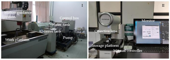 The experimental equipment and data acquisition equipment. (I) The system is composed of six parts: a tank, a high-pressure pump, a water pump frequency control box, a motion guidance system, and a work platform. (II) The equipment is composed of four parts: an object lens, a storage platform, a manual controller, and a monitor.