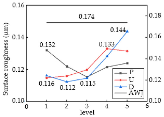 Figure 5 shows the analysis results of the range of surface roughness, including the results of the orthogonal experiment (P, U, and D) and control experiment (AWJ). The maximum Sa value in Group D is 0.144μm, corresponding to a stand-off distance of 9 mm; the minimum Sa value is 0.112 μm, corresponding to a stand-off distance of 3 mm. The maximum Sa value in Group P is 0.132 μm, corresponding to a jet pressure of 10 MPa, and the minimum Sa value is 0.115 μm, corresponding to a jet pressure of 20 MPa. The maximum Sa value in Group U is 0.133 μm, which corresponds to a traverse speed of 120 mm/min; the minimum Sa value is 0.115 μm, corresponding to a traverse speed of 30 mm/min.