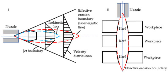 Kerf taper is an important metric for assessing the cutting accuracy of ASJ. It is defined as the difference between the width of the upper surface and that of the lower surface of the ASJ cutting seam divided by two. As the depth of the cutting seam increases, the energy of the ASJ decays, reducing the ability of the ASJ to remove material, coupled with changes in the velocity of the ASJ, ultimately leading to the formation of the kerf taper. Changing the cutting ability of the ASJ, such as by altering the jet pressure, traverse speed, impact angle, abrasive particle size, abrasive flow rate, and abrasive hardness parameters, will alter the kerf taper. Based on the flow field structure of the water jet (Figure 6I), the jet pressure and stand-off distance parameters can modify the effective erosion boundary of the jet and the contact location with the workpiece, which alters the contour and taper of the cut, as shown in Figure 6II.