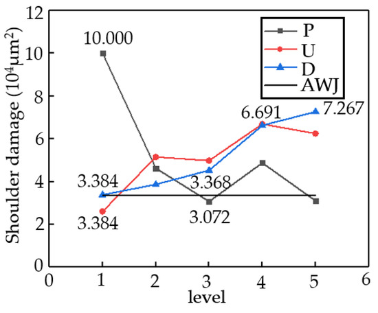 Figure 9 presents a range analysis of the shoulder damage (SD). The smaller the value of SD, the smaller the damaged area and the better the cutting quality. In Group D, the maximum SD value is 72,668 μm2 with a corresponding D of 9 mm, while the minimum SD value is 33,840 μm2 with a corresponding D of 1 mm, with a range value of 38,828 μm2. In Group P, the maximum SD value is 99,992 μm2 with a corresponding P of 10 MPa, while the minimum SD value is 30,719 μm2 with a corresponding P of 20 MPa, with a range value of 69,273 μm2. In Group U, the maximum SD value is 46,256 μm2 with a corresponding U of 60 mm/min, while the minimum SD value is 26,069 μm2 with a corresponding U of 30 mm/min, with a range value of 20,187 μm2. Therefore, the optimal processing quality can be obtained when the jet parameters are D = 1 mm, P = 20 MPa, and U = 30 mm/min. Based on the range values, the jet parameters affecting SD from largest to smallest are P > U > D. The common feature of SD being large at several points is that their cutting abilities are low, and either P is small (10 or 15 MPa), U is high (120 or 160 mm/min), or both. When the cutting ability exceeds a certain value, the decrease in SD slows down. Comparing the two cutting methods, when the abrasive cutting abilities of the two jet modes are similar, the processing ability of AWJ pure water jet is much greater than that of ASJ pure water jet, resulting in less shoulder damage during processing, consistent with the trend shown in Figure 9. In summary, AWJ performs better in terms of the shoulder damage index.
