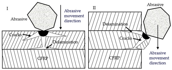 Interlayer delamination is one of the common defects observed during the AWJ cutting of CFRPs, mainly manifesting as gaps between different layers of carbon fiber board, which can affect overall performance. The formation of delamination is divided into internal and external causes. The former refers to the defects formed during the manufacturing process due to an uneven distribution of materials and other reasons, while the latter refers to the formation of layering under the combined action of abrasive particles and the water jet. As shown in Figure 10I, particles impact the surface of the material, causing cracks on the surface, and then water seeps into the cracks through water wedge action, allowing the cracks to expand and extend to the layer connection, where they cause interlayer delamination by squeezing and breaking the layer boundary. As shown in Figure 10II, particles impact the convex part of the cutting surface, causing cracks at the convex part, and then under the impact of water, the convex part of the material undergoes brittle fracture and forms irregular pits with cracks at the cutting surface. Subsequently, under the action of a water wedge, the crack extends to the layer boundary and forms interlayer delamination. In summary, the main cause of interlayer delamination is the water wedge action of a pure water jet. Therefore, jet pressure is the main factor affecting interlayer delamination, and compared with AWJ, ASJ has lower jet pressure and can be expected to have fewer layering defects.