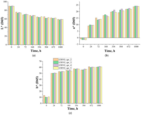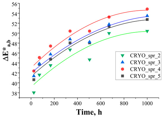 | Test Duration (h) | L*(D65) | a*(D65) | b*(D65) | ΔE*a,b |