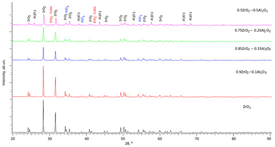 Thus, summarizing the characterization of changes in the phase composition of (1 − x)ZrO2–xAl2O3 ceramics at variation of weight contributions of the components, the general dynamics of phase transformations can be described in the following format: ZrO2 → ZrO2/Al2O3 → ZrO2/Al2O3/AlZr3 → ZrO2/Al2O3/AlZr3/c-ZrO2.