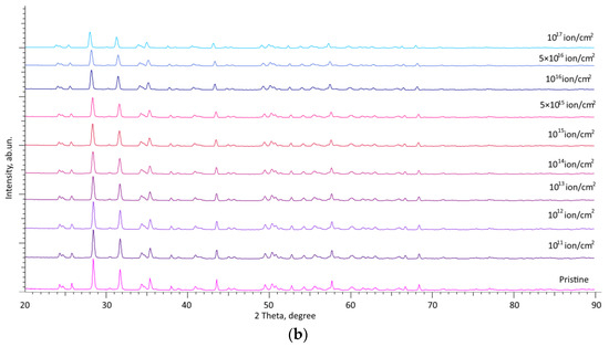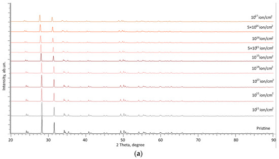 One of the ways to evaluate the influence of radiation damage on the properties of structural materials or ceramics is through the application of the X-ray diffraction method used to define the kinetics of changes in structural parameters and their deformation as a result of accumulating radiation damage. In addition, a number of studies have established that deformation distortions of the crystal structure of ceramics as a result of radiation damage accumulation can lead to the complete destability of ceramics and their amorphization [24,25]. Also, the accumulation of structural changes associated with radiation damage for zirconium dioxide-based ceramics can initiate the processes of polymorphic transformations, which are followed by degradation of both strength and thermo-physical parameters. Using X-ray diffraction data, in particular, the determination of changes in the characteristics of the crystal lattice and its volume, it is possible to define the influence of irradiation on their changes, as well as to find out the deformation distortion type (compressive or tensile) arising from the accumulation of structurally altered regions in the damaged layer.
