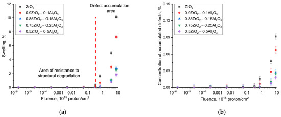 With proton irradiation, due to the small size of the protons themselves as well as their high penetration ability, ionization losses of protons in interaction with the crystal structure have a much smaller effect than heavy ions, and the main structural damage is primarily due to the accumulation effect associated with the agglomeration of implanted hydrogen with the subsequent formation of gas-filled bubbles [33,34]. The formation of such inclusions, as a rule, occurs at high irradiation fluences (above 1016 proton/cm2), for which the calculated concentration of implanted hydrogen can be several atomic percent. In this regard, the observed kinetics of the change in structural parameters have good correspondence with this substantiation, since the most pronounced changes occur at fluences above 1015 proton/cm2. In such a case, the greatest structural changes caused by degradation and swelling of the crystal lattice due to the accumulation of structurally deformed regions as well as the formation of gas-filled regions are observed for ZrO2 ceramics. In the case of two- to three-phase ceramics, the effects relating to deformation and swelling of the crystalline structure are less pronounced because of the presence of interphase boundaries that reduce the possibility of agglomeration of implanted hydrogen in the affected layer of ceramics. As is evident from the reported data in Figure 4a, reflecting the value of stability of the crystal structure to swelling at the maximum irradiation fluence (1017 protons/cm2) in comparison with ZrO2 ceramics, the presence of Al2O3, AlZr3, and c-ZrO2 phases results in a significant increase in the stability of the crystal structure to radiation-induced swelling.