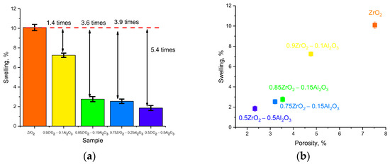 (a) Results of comparison of the increase in swelling resistance of ceramics compared to ZrO2 ceramics; (b) Comparative analysis of changes in the maximum value of swelling and porosity of ceramics in the initial state, determined using the gravimetric method.