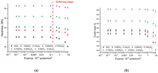 Figure 5 summarizes the measured data on the strength characteristics (hardness and resistance of ceramics to single compression) as a function of irradiation fluence for all the samples studied. Received dependences on changes in strength properties were characterized in two stages. First, the influence of variation in the composition of (1 − x)ZrO2–xAl2O3 ceramics on the change in strength characteristics was determined in order to identify strengthening factors related to the change in phase composition. Secondly, the dependences of change in strength properties for irradiated samples at variation of irradiation fluence were determined. According to the data obtained for the initial samples, the change in phase composition increases the resistance of ceramics to both single compression and strengthening by increasing the hardness and resistance to cracking. In such a case, the increase in stability plays a very significant role in increasing the stability of the strength properties against radiation damage resulting from high-dose irradiation and subsequent swelling processes.