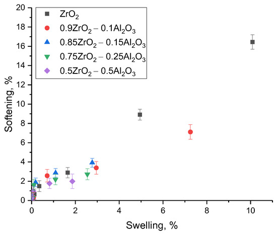 This phenomenon might also be accounted for by the presence of an increase in dislocation density and interfacial boundaries in the structure during the formation of two- to three-phase ceramics, the presence of which can prevent the agglomeration of implanted hydrogen by inhibiting it at the boundaries, preventing it from agglomerating into large gas-filled bubbles, leading to an increase in the deformation distortion of the crystal structure. According to the obtained data, the improvement of resistance to swelling with increasing concentrations of Al2O3 in the composition of ceramics results in a 3–5-fold increase in resistance to structural degradation in comparison with ZrO2 ceramics with a monoclinic type of crystal structure.