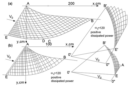 Ongoing studies have shown that for a cohesive medium, the kinematically admissible mechanisms [26] describe the kinematics of the failure process quite well for both active and passive pressures. Even complex processes related to the working problem of loader bucket models can be described in the same manner [25,27,28,29]. Associated and non-associated flow rules have been applied to describe such processes. For example, the non-associated flow rule has been used to describe a quite advanced wall pushing process [27,29].