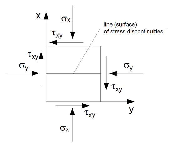 From this, it follows that the stresses on both sides of the discontinuity surface must be the same in such a structure. The stress parallel to this line may experience a spike.