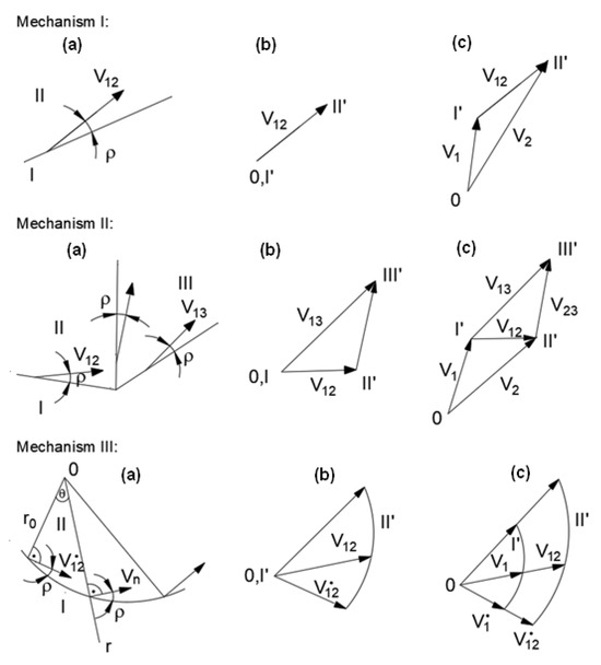 Regardless of the mechanism adopted, a hodograph—a velocity plan incorporating velocity vectors related to a common pole—should be made in each case, using the properties of the velocity field [30].