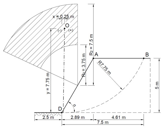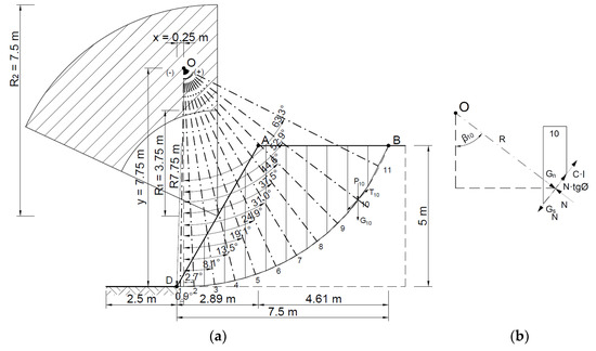 Figure 9 shows a diagram of the analyzed slope, where, according to the Fellenius method, the point of theoretical rotation O is marked, with the following coordinates x = 0.25 m and y = 7.75 m, and the cylindrical slip plane is plotted.
