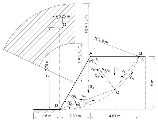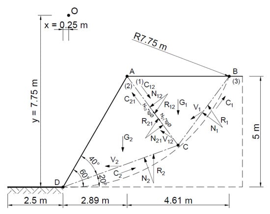 The stability analysis of the selected slope was also carried out by assuming two rigid blocks as the failure mechanism. The area at risk of the landslide was assumed to be as in the Fellenius method, entering the rigid area—the triangle ABC and ACD.