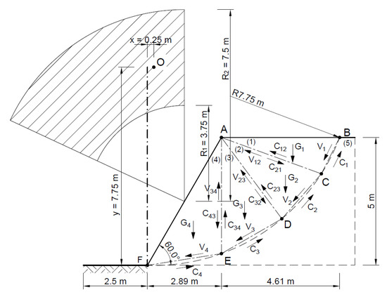 It is assumed that in the areas shown in Figure 5, the state of stress is determined by Equations (7)–(11). These relationships must be statically admissible and meet the conditions of discontinuity of stress—dashed lines indicate the lines of discontinuity of stress (Figure 2).